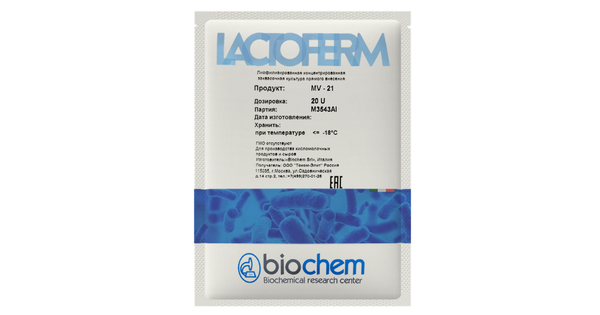 Тип закваски: Мезофильно-термофильная Лактобактерии: Lactococcus lactis subsp. lactis; Lactococcus lactis subsp. cremoris; Streptococcus salivarius subsp. Thermophilus; Lactobacillus Helveticus; Lactobacillus delbrueckii subsp. Lactis. На объем молока (прямое внесение): 5000 литров Подходит для сыров: эмменталь; королевский; швейцарский Производитель/торговая марка: BIOCHEM s.r.l. Страна производства: Италия Комплектация: Термофильно-мезофильная закваска Lactoferm-Biochem EM 20U (на 5 тонн) в саше-пакете - 1 шт.